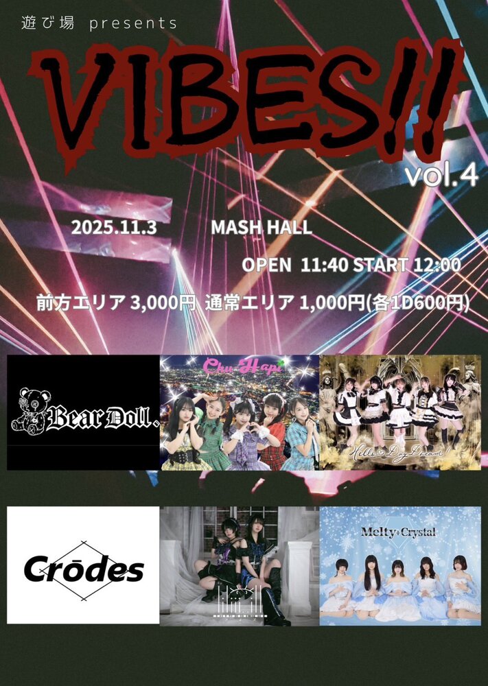 札幌遠征 遊び場presents 「VIBES!!vol.4」 SCHEDULE 2025/11/03(月) MASH HALL OPEN 11:40 START 12:00 Chu-Hapi出演時間は 12:00-12:20 並行物販 \札幌遠征/ 遊び場presents 「VIBES!!vol.4」 詳細は、下のリンクよりどうぞ! チケット詳細はこちら URLをコピーする 報告する